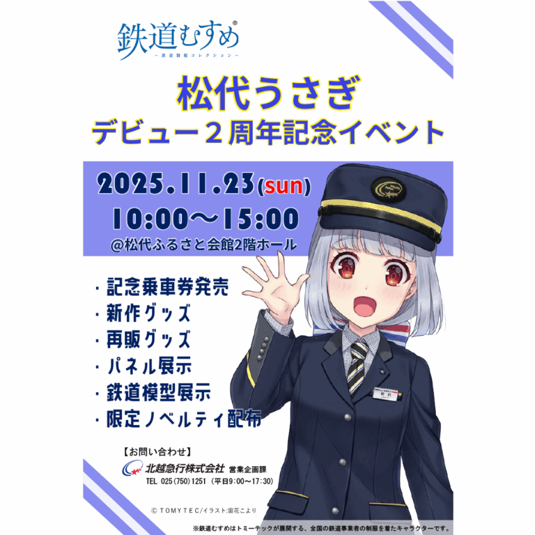 鉄道むすめ「松代うさぎ」のデビュー2周年を記念したイベントを開催します! 日時:2025年11月23日(日) 10:00~15:00(開場9:50) 場所:松代...