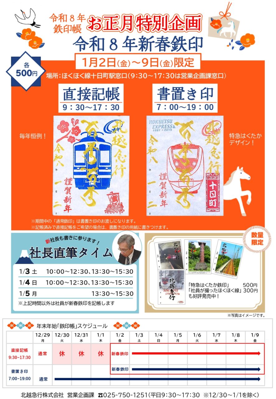 北越急行では、毎年恒例のお正月特別企画「新春鉄印」を販売中です。 今年は2種の販売です。 【期間】 令和8年1月2日(金)~9日(金) 限定! 【受付時間】 書...