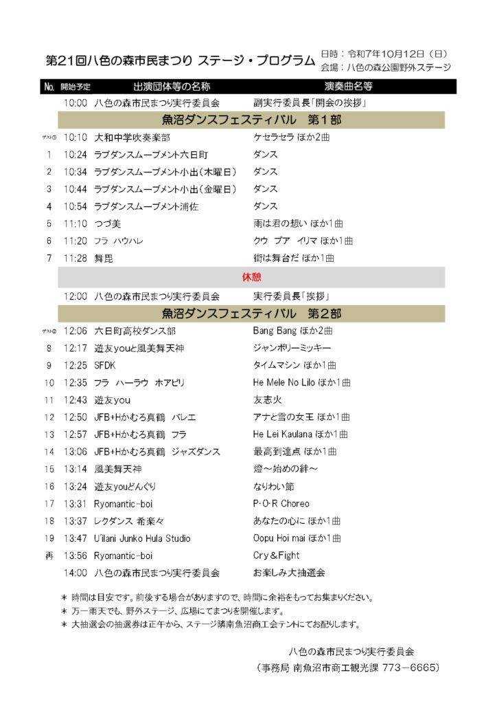 2025年10月12日(日)、八色の森公園で「第21回八色の森市民まつりwith雪国秋フェス」を開催します。家族みんなで楽しめるイベントとなっております。また、まつり会場内ステージでは、10時00分より「魚沼ダンス・フェスティバル」を開催します。当日のステージでは、見どころ満載のダンスをお届けします。まつりならではの賑やかなステージをお楽しみください。