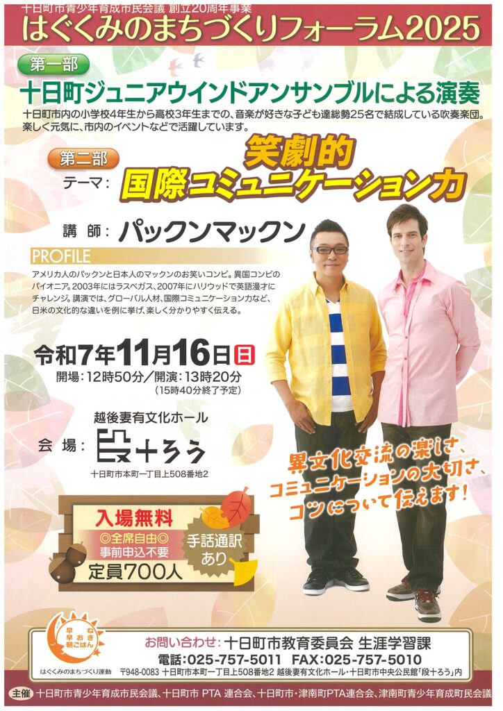 第2部は、「笑劇的国際コミュニケーション力」で講師はパックンマックン。異文化交流の楽しさ、コミュニケーションの大切さ、コツについて伝えます。