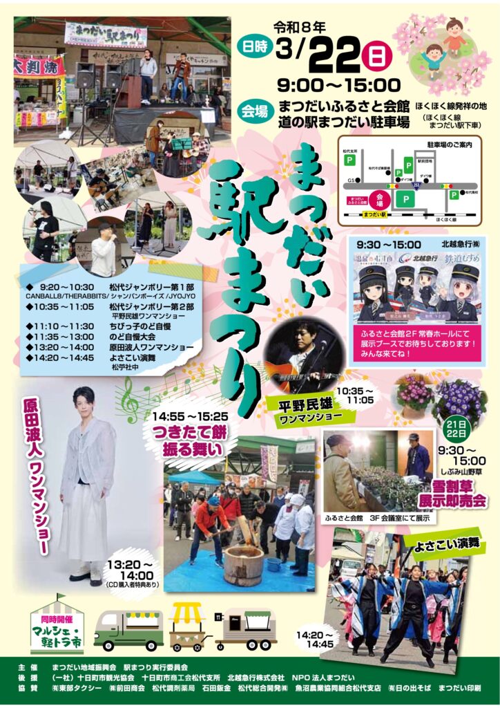 十日町市にて、「まつだい駅まつり」が2026年3月22日(日)に開催されます。会場は、ほくほく線まつだい駅にある「道の駅まつだいふるさと会館」の駐車場。特設ステージでは、音楽ライブ「松代ジャンボリー」やのど自慢大会、原田波人ワンマンショー、よさこい演舞などが催され、終盤にはつきたてのお餅が振る舞われます。